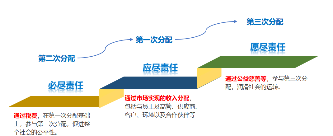 社會責(zé)任在實(shí)現(xiàn)共同富裕中既是路徑之一,也是職責(zé)所在。我們說社會責(zé)任最簡單是有三個層次,必盡、應(yīng)盡、愿盡。這三個責(zé)任,大家熟悉的是慈善捐贈的功能是第三次分配,在企業(yè)里面是愿盡責(zé)任。我們知道稅收、稅費(fèi)的功能是法律法規(guī)的必盡責(zé)任,這是第二次分配。