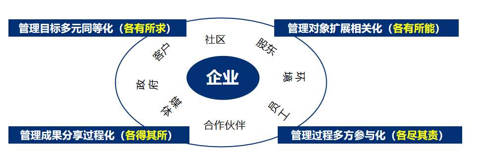 所以這四大特征的管理就是企業(yè)管理的目標(biāo)要反映各相關(guān)方的訴求,體現(xiàn)各有所求,管理的對象要找到各個利益相關(guān)方的特長,識別各有所能,管理的過程之中要發(fā)揮各個利益相關(guān)方的作用,創(chuàng)造各盡其責(zé),管理的成果要匹配相關(guān)方的參與,實(shí)現(xiàn)各得其所,不能企業(yè)自己得到好處。這是一種新型的企業(yè)管理,我們也可以稱之為社會責(zé)任的管理。