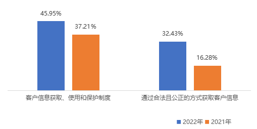 45.95%的汽車企業(yè)披露了建立客戶信息獲取、使用和保護(hù)制度,同比提高8.74個(gè)百分點(diǎn);32.43%的汽車企業(yè)通過合法且公正的方式獲取客戶信息,同比提高約16個(gè)百分點(diǎn)。