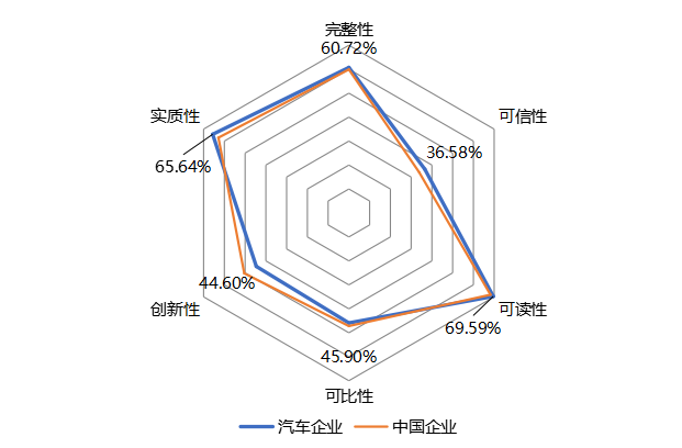 汽車企業(yè)報(bào)告在報(bào)告評(píng)估六大評(píng)估維度的得分率從高到低依次為:可讀性、實(shí)質(zhì)性、完整性、可信性、可比性、創(chuàng)新性??勺x性、實(shí)質(zhì)性、完整性以及可信性均高于中國(guó)企業(yè)報(bào)告。其中,可讀性表現(xiàn)最好達(dá)到69.59%,較中國(guó)企業(yè)平均水平高1.35個(gè)百分點(diǎn);實(shí)質(zhì)性表現(xiàn)次之,為65.64%,較中國(guó)企業(yè)平均水平高2.78個(gè)百分點(diǎn)。創(chuàng)新性、可比性接近中國(guó)企業(yè)平均水平,分別為44.60%、45.90%。