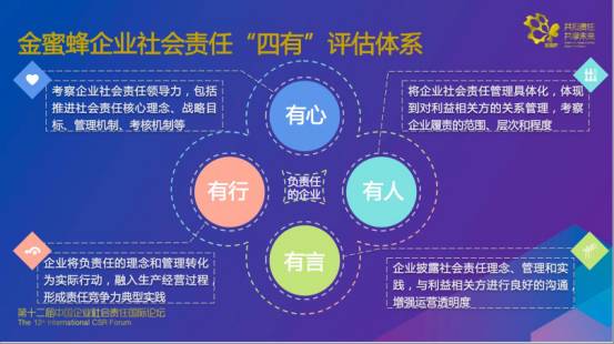 2017年6月6日,在第12屆中國企業(yè)社會責任國際論壇上,《WTO 經(jīng)濟導刊》副社長、責揚天下(北京)管理顧問有限公司首席專家殷格非發(fā)布《金蜜蜂中國CSR指數(shù)報告2016》,并介紹了金蜜蜂企業(yè)社會責任“四有”評估體系及進展、中國企業(yè)社會責任發(fā)展建議。