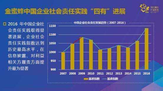 2016年中國企業(yè)社會責任實踐取得突破性進展,企業(yè)社會責任實踐指數(shù)達到歷史最高水平,在信息披露、對利益相關方履責方面提升最為顯著。