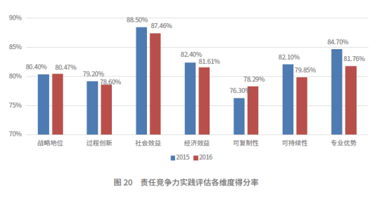 企業(yè)責任競爭力實踐水平穩(wěn)中有升,在提升實踐的影響力、發(fā)揮實踐的示范、推廣價值方面表現(xiàn)尤為突出,但是在發(fā)揮企業(yè)的專業(yè)優(yōu)勢、可持續(xù)性、創(chuàng)新性等方面同比略有下降。