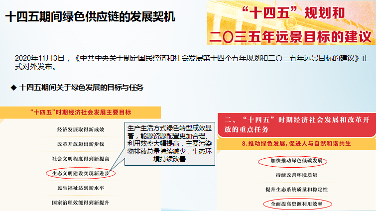 今年是我國十三五規(guī)劃收官之年,也是十四五規(guī)劃的布局之年, 中國最新發(fā)布的《中共中央關于制定國民經濟和社會發(fā)展第十四個五年規(guī)劃和二〇三五年遠景目標的建議》提出了關于加快推動綠色低碳發(fā)展的一系列具體任務,明確提出深入實施可持續(xù)發(fā)展戰(zhàn)略,完善生態(tài)文明領域統(tǒng)籌協(xié)調機制,構建生態(tài)文明體系,促進經濟社會發(fā)展全面綠色轉型。這也為綠色供應鏈建設提供了新的發(fā)展機遇。