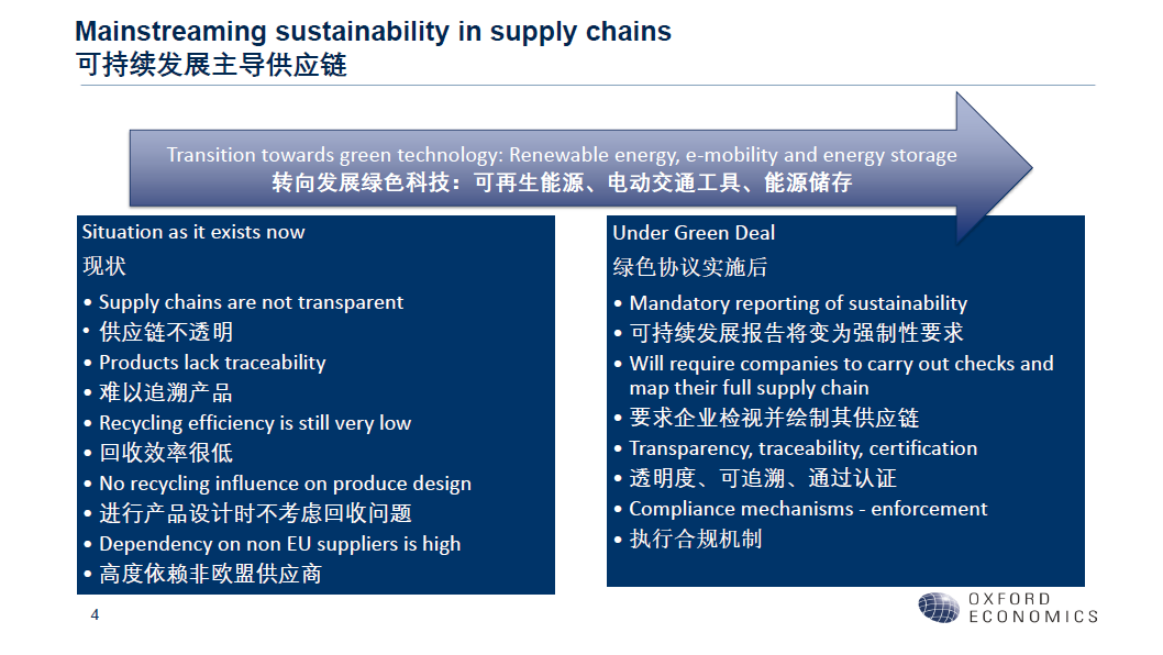 牛津經濟研究院專題研究負責人James Nixon博士在主旨發(fā)言中介紹了《歐洲綠色協(xié)議》的主要內容、相關監(jiān)管標準以及綠色新政對供應鏈的影響,并以德國汽車工業(yè)為例分析了可持續(xù)供應鏈面臨的一些問題,最后指出綠色新政實施后可能存在的一些挑戰(zhàn),即如何在實現(xiàn)清潔能源轉換模板與滿足原材料需求增長間取得平衡、成本增加將影響企業(yè)競爭力、持續(xù)對話和談判優(yōu)于碳邊境關稅等。