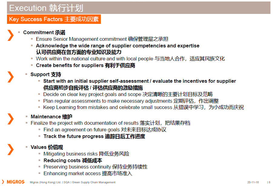 美高斯集團對于可持續(xù)發(fā)展是非常重視,認真承擔其對社會和環(huán)境的責任。政治方面的必要性、以客戶為焦點、以影響為焦點以及成本角度都是關鍵驅動因素。政治方面的必要性即是政府鼓勵甚至創(chuàng)造企業(yè)更多得認可綠色發(fā)展相關的行動指南?;谶@樣的驅動因素,美高斯集團識別出了產品種類、氣侯與能源、封閉循環(huán)系統(tǒng)以及社會凝聚力四類關鍵領域,并以此總結出了四大主要成功因素,助力其綠色供應鏈建設。