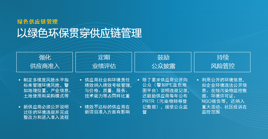 最后,推動綠色供應鏈轉型需要從采購開始。另外,行業(yè)組織在其中能夠發(fā)揮非常重要的作用,像amfori和中電標協(xié)整體上推動了企業(yè)的綠色供應鏈建設。