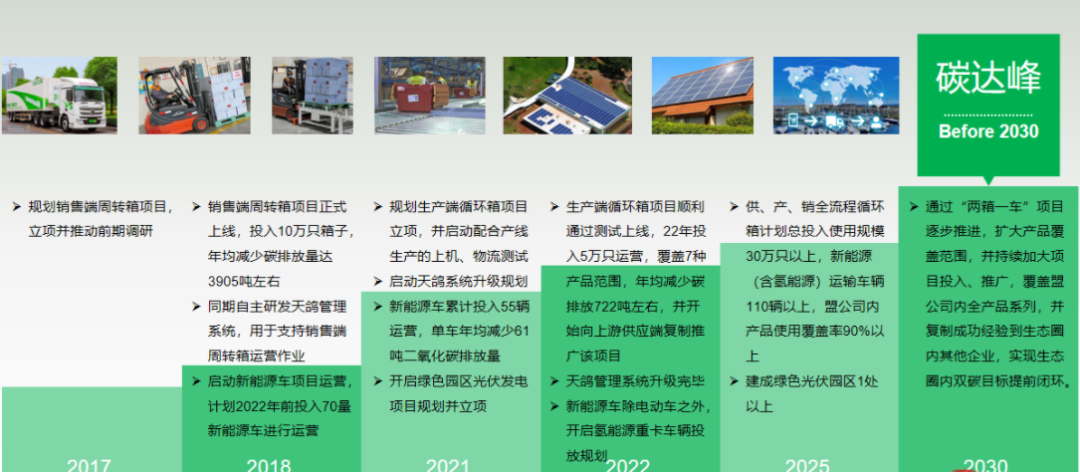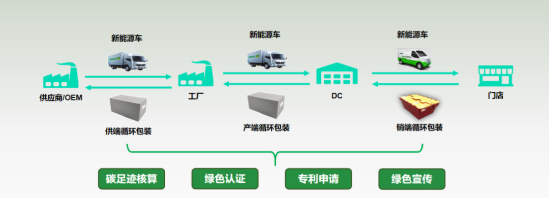 產(chǎn)端循環(huán)——推動(dòng)工廠到DC倉實(shí)現(xiàn)生產(chǎn)循環(huán)箱應(yīng)用、干線氫能源車運(yùn)輸設(shè)備節(jié)能改造光伏能建設(shè)